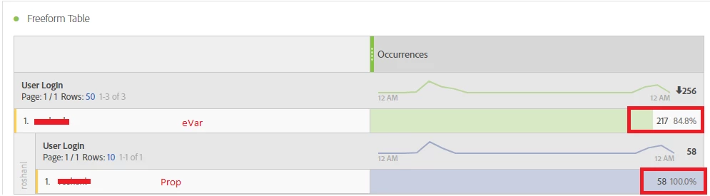 In this case, the prop would have two occurrences because it was set twice, and they don't persist. For the eVar, it would have 4 occurrences. It was set twice on the A page views, however during page views B and C the eVar persisted, with the value that was set during the first page view.