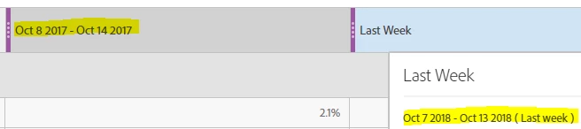 I'd like to have a comparison of my KPIs with last year for yesterday, last week and last month. I managed to do this for last week and last month with the default setting "This week/month last year to this date range" but cannot find the same setting for the yesterday last year comparison. I am aware of that I can set a custom date range but face the following problem by doing this: Due to the 4-5-4 calendar system, the year 2017 was a 53-week year, with January consisting of 5 weeks instead of the usually 4 weeks. According to the National Retail Federation (NRF), 53-week years are restated for comparability purposes (read here for further information). Unfortunately, the calendar used in Workspace is not restated so that when I want to compare yesterday, the 14th October, with yesterday last year, the target day would be the 8th October resulting in that those two days are incomparable.