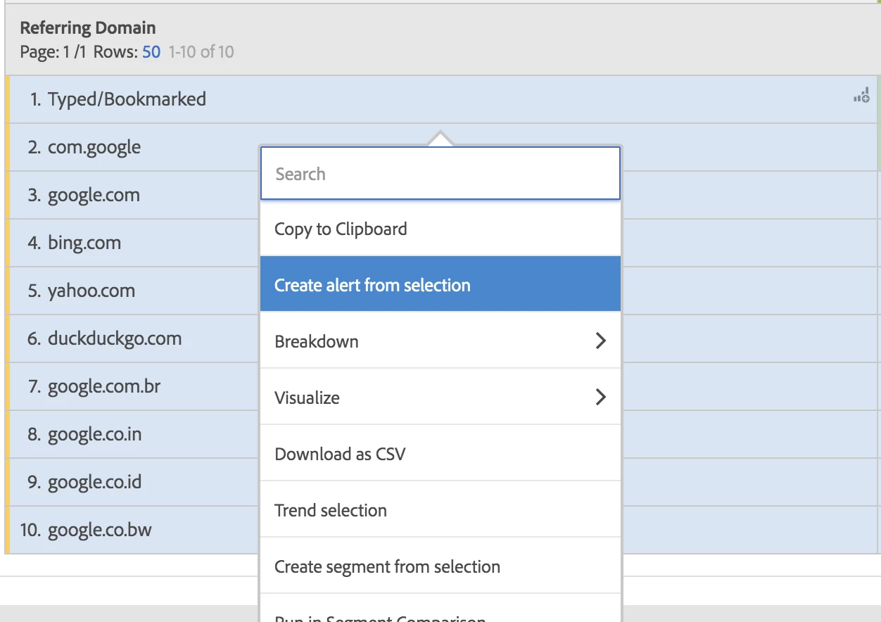Since there are so many "referrer domains", we are not able to set alert one by one, but want to find a way:
