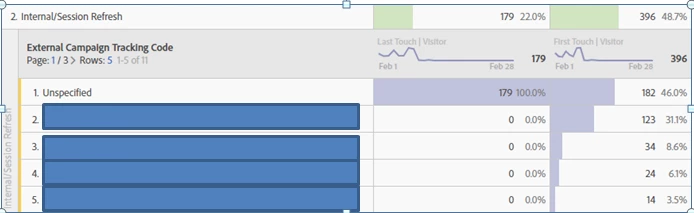 For instance in the case above, External campaign tracking code no.2 should be attributed back to the channel :" display ad & banner" in accordance to my processing rule. However, although there is no numbers for last touch, due to the visitor from first touch column, the external campaign tracking code was categorized into the channel:" Internal/Session Refresh".