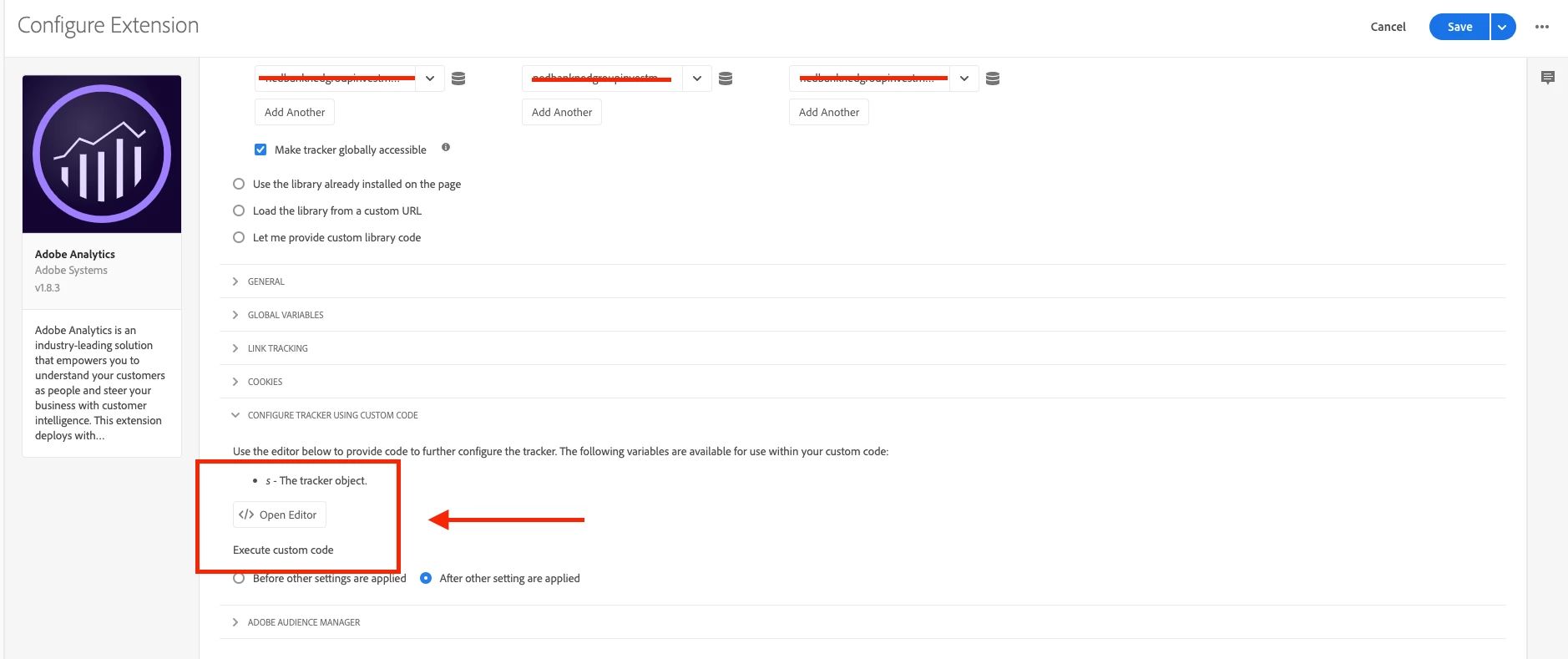 CONFIGURE TRACKER USING CUSTOM CODE and start editing under the editor