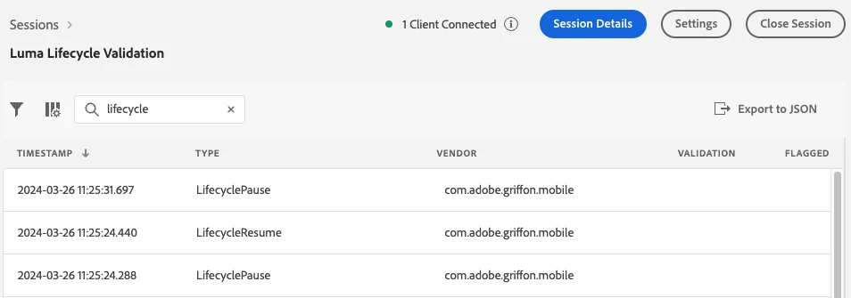 Use AEP Assurance to validate that the Lifecycle start and pause calls are happening as expected. With AEP Assurance installed, connect to a session to validate the Adobe logs.