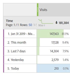 I have a report that has several time dimensions, among them are today and yesterday. The report is run automatically at midnight to catch the days totals. A summary number widget catches the visits for today, a summary change widget looks at the change from yesterday to today.