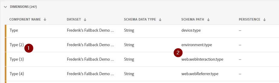 Today, default Component Names in Customer Journey Analytics are based on the XDM display name of the field alone. However, that leads to potentially many components having the same name (1) while coming from very different paths in the Schema (2):