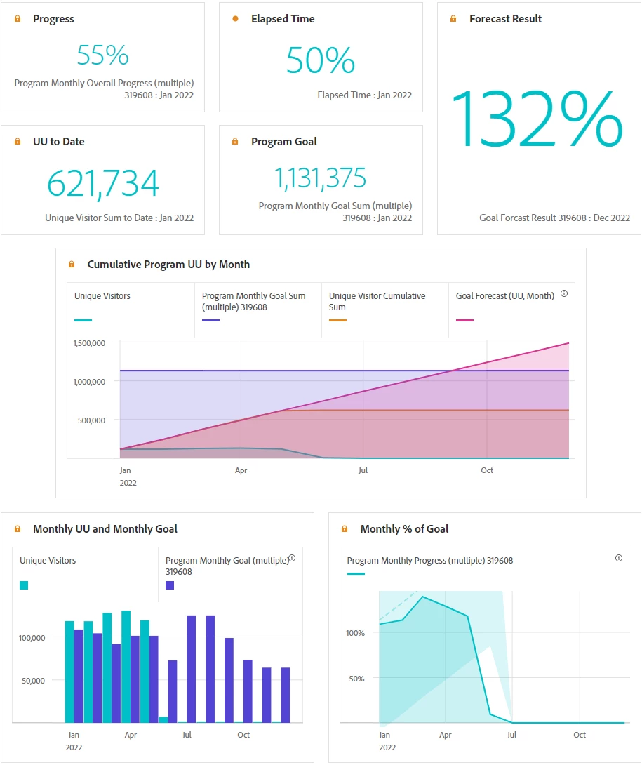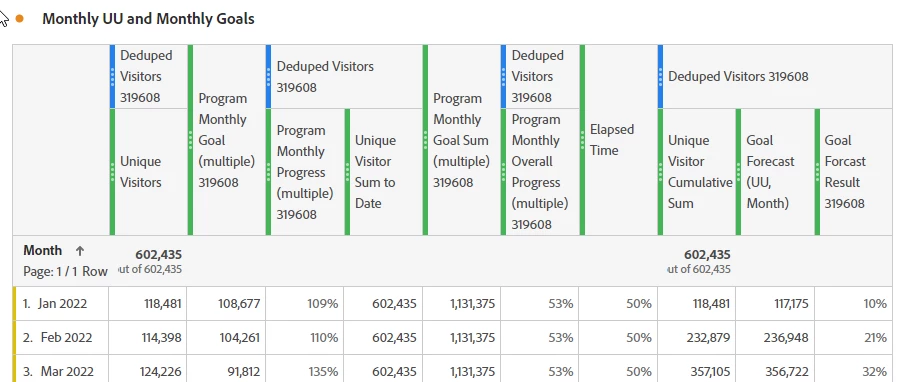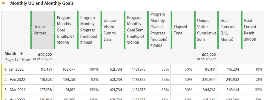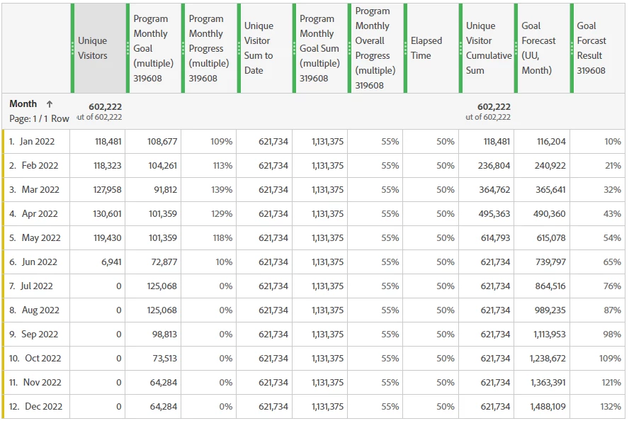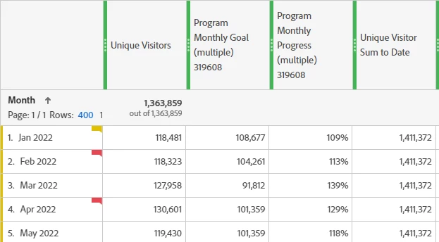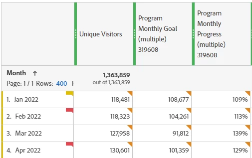 - Create a metric that shows the program monthly overall progress of the program to date. This shows the percent complete to date for the goal metric. It is calculated by the sum of Unique Visitors to date divided by the sum of monthly goals. It is the same number for each monthly row.