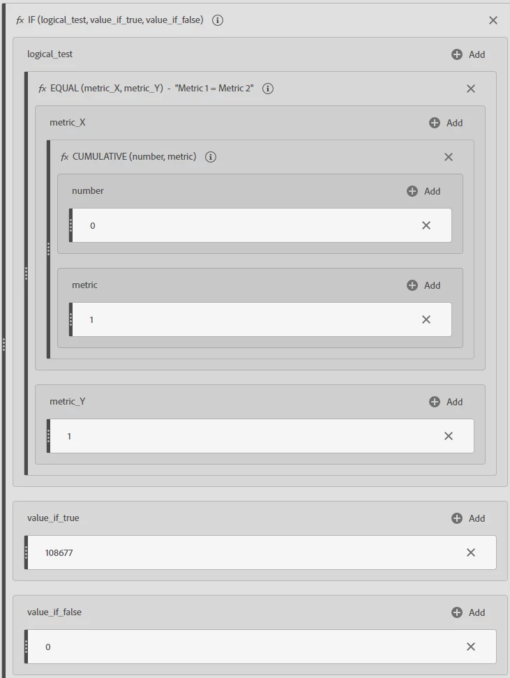 - In the “If” function value_if_true box, drag in the Cumulative function (from the components bar in the function section).
