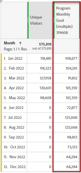 - Program Monthly Goals. The second metric is a calculated metric that enters the different goals for each month.