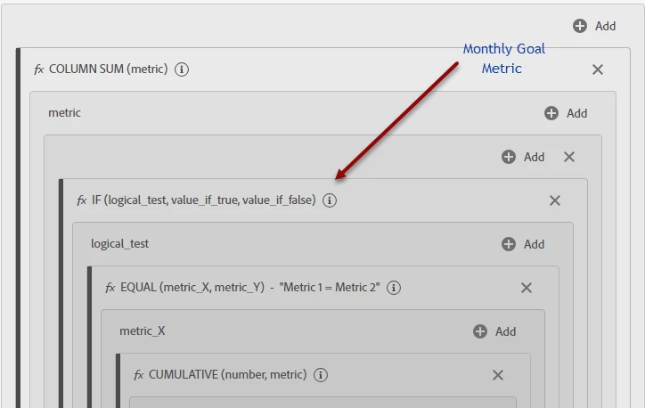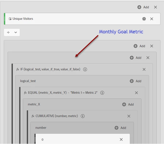 So far, you have used the Cumulative function to number each month in the trended series. You used the Equal function to ask if the month number is 1 (metric_y). If so (the If logic function) set the value_if_true, which is the monthly goal. If not it sets no value. In other words, if the value is Jan (month 1) then set the value to your goal (value_if_true). - Next, repeat this all for the next month. Follow the steps above for each month, but set the metric_Y value to 2 (meaning the second month), and the value-if-true to the second month's goal.