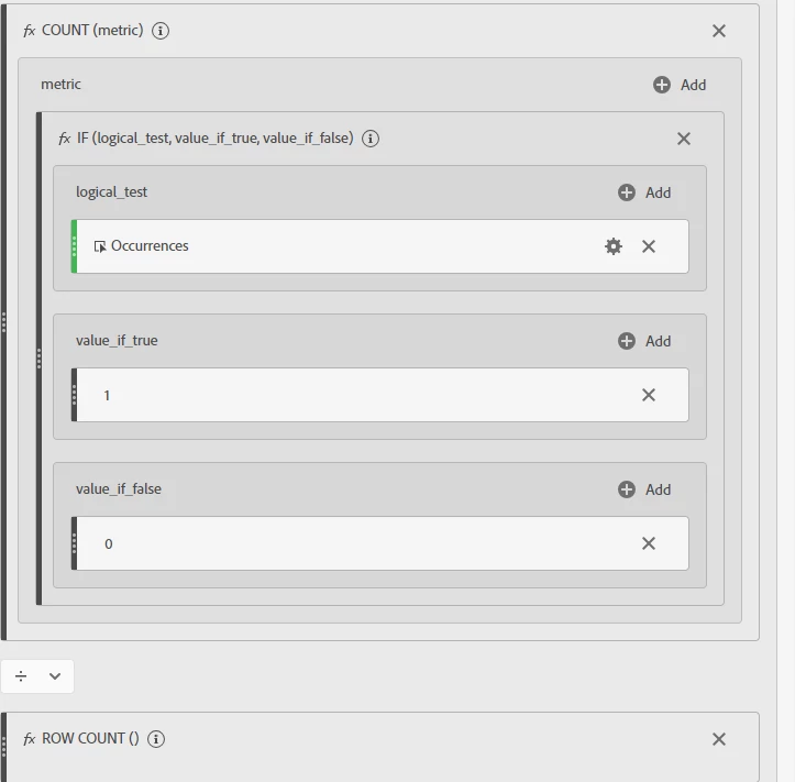 - Then, underneath this section, drag in a new function called “row count”. Be sure to set the operator between the two sections to divide.