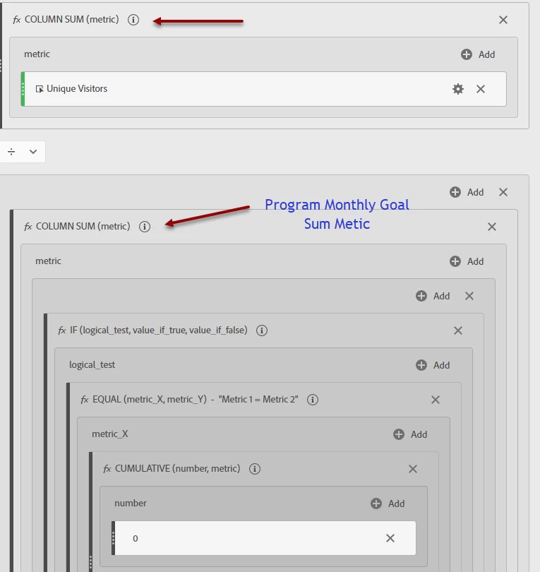 - Drag the “Program Monthly Goal Sum” metric you create above to just below the Column Sum Box. The division operator should be between the two sections.