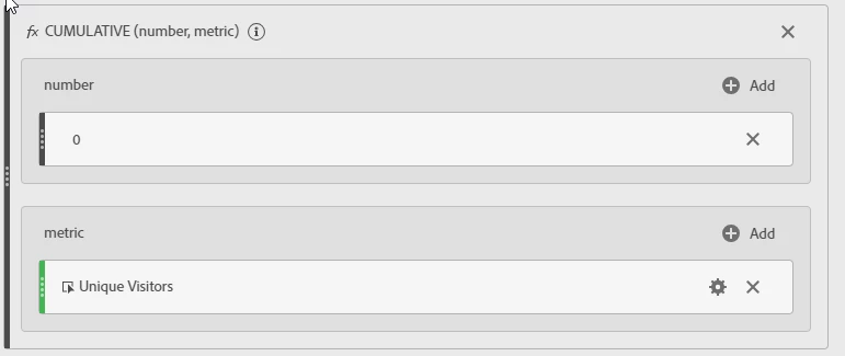 - Create the metric to show the unique visitors cumulative sum. This provides the Unique Visitors for the current month added to the Unique Visitors for the prior months. E.g. for month 4, this would be UU for month 1 + UU for month 2 + UU for month 3 + UU for month 4. We will dedupe these visitors across months later.
