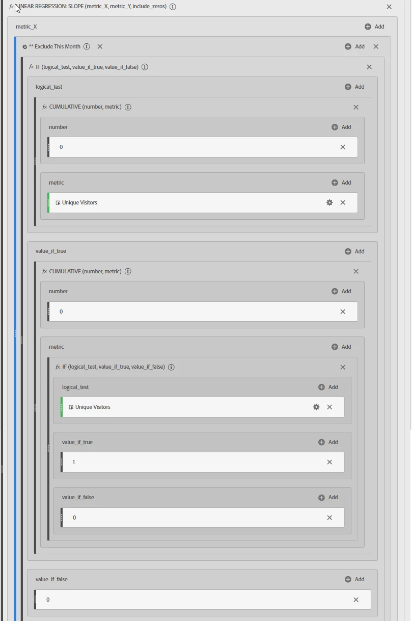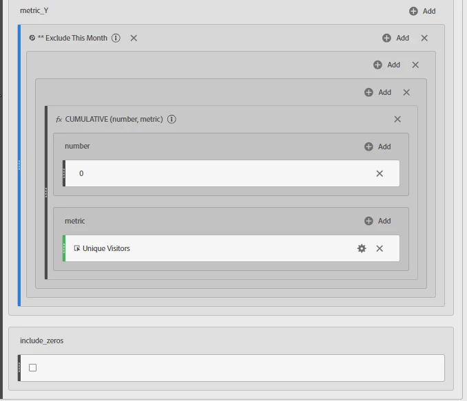 - Drag the “Cumulative” function into the metric box for Exclude This Month.