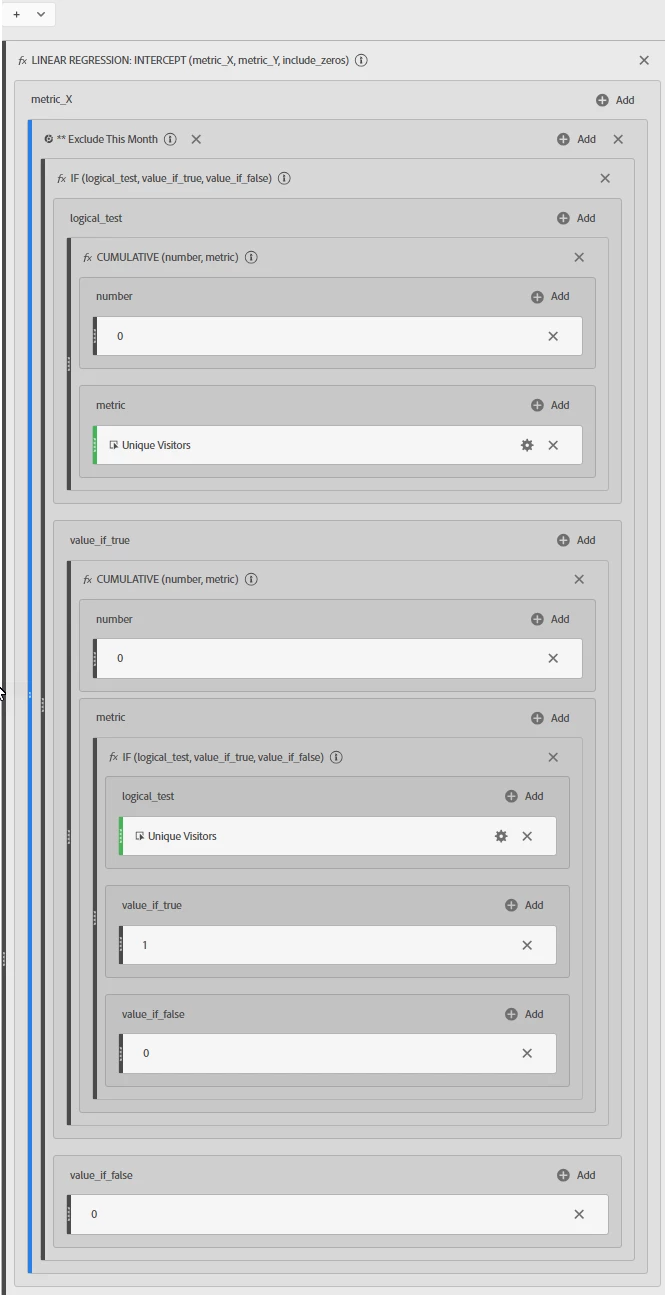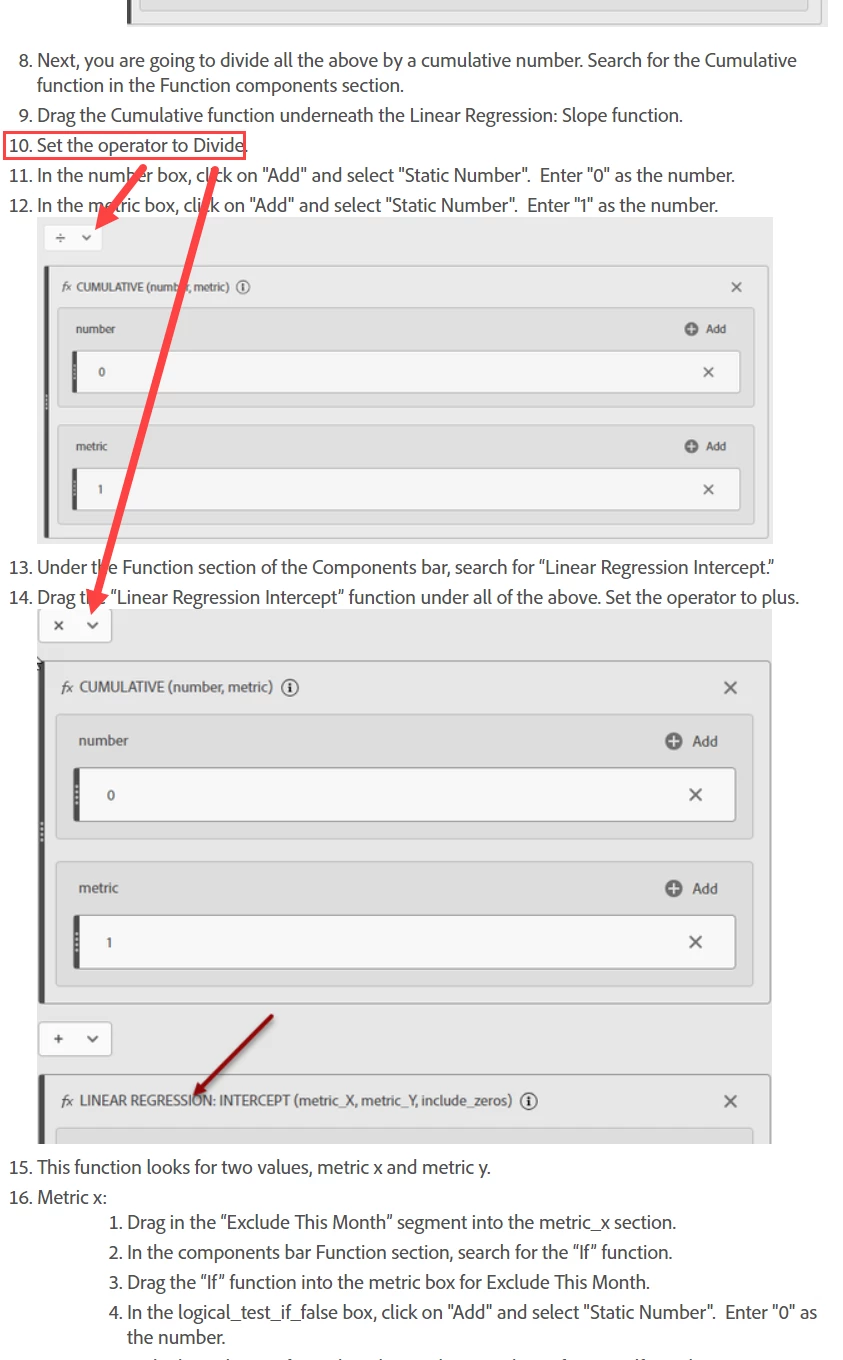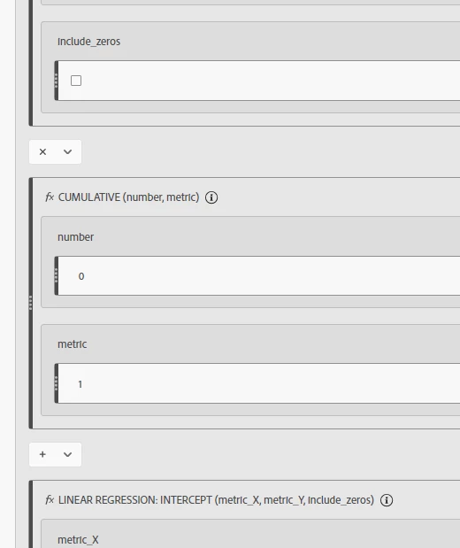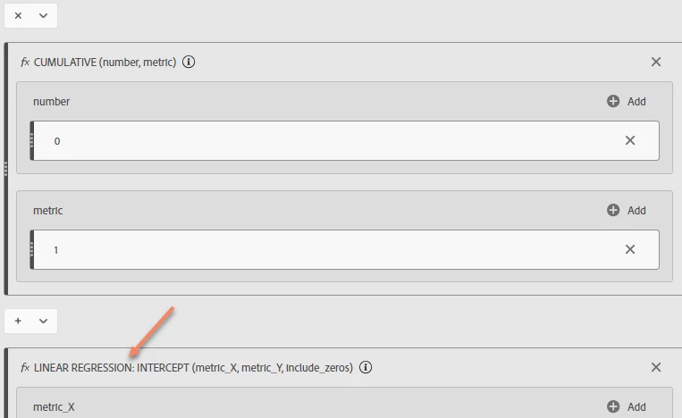 - Drag the “Linear Regression Intercept” function under all of the above. Set the operator to plus.
