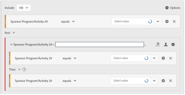 Then create a segment that captures the scope of the traffic contributing to the goal. In this case, I use the element in a variable representing the program name which is set on every page of the program.
