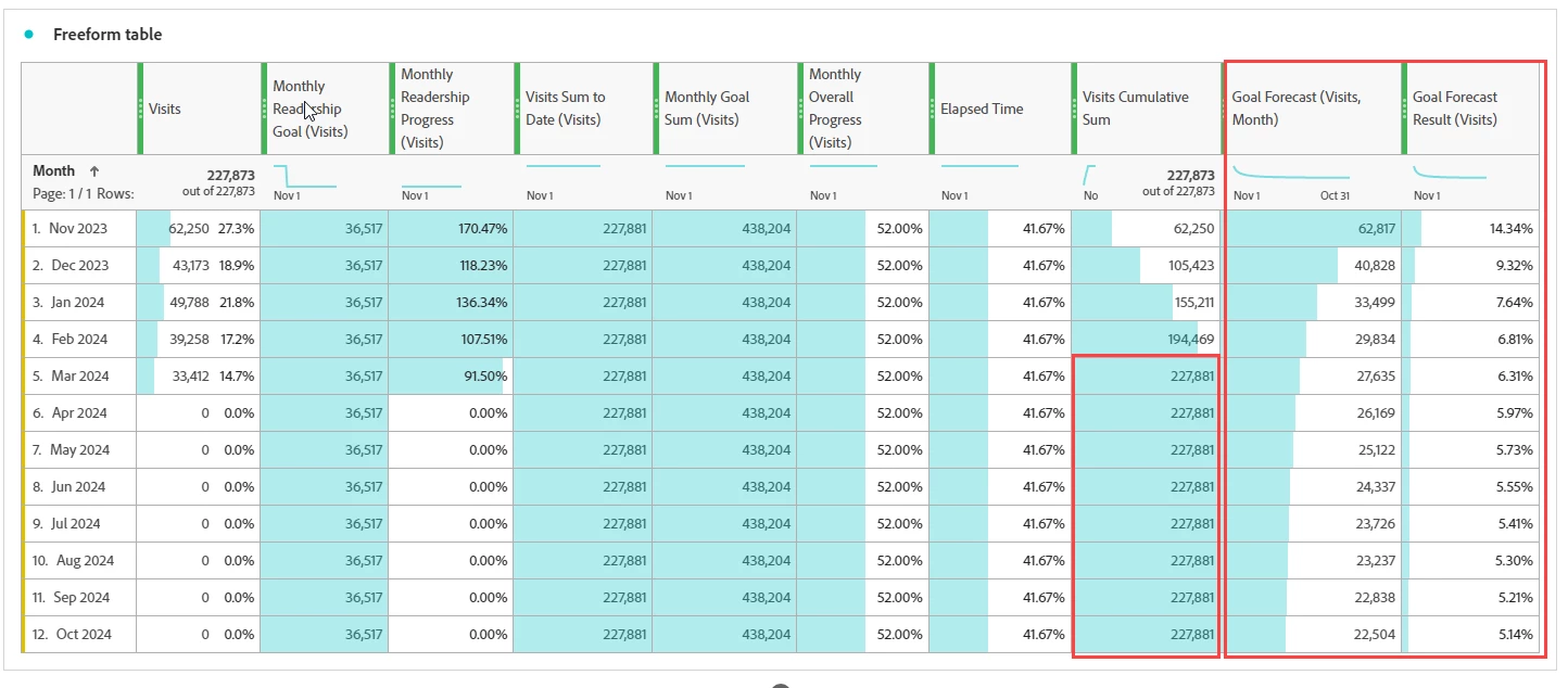 When the table sums, it currently adds unique visitors across months. However, in the given example, we are dealing with an annual goal. I will show you how to deduplicate visitors across months later.