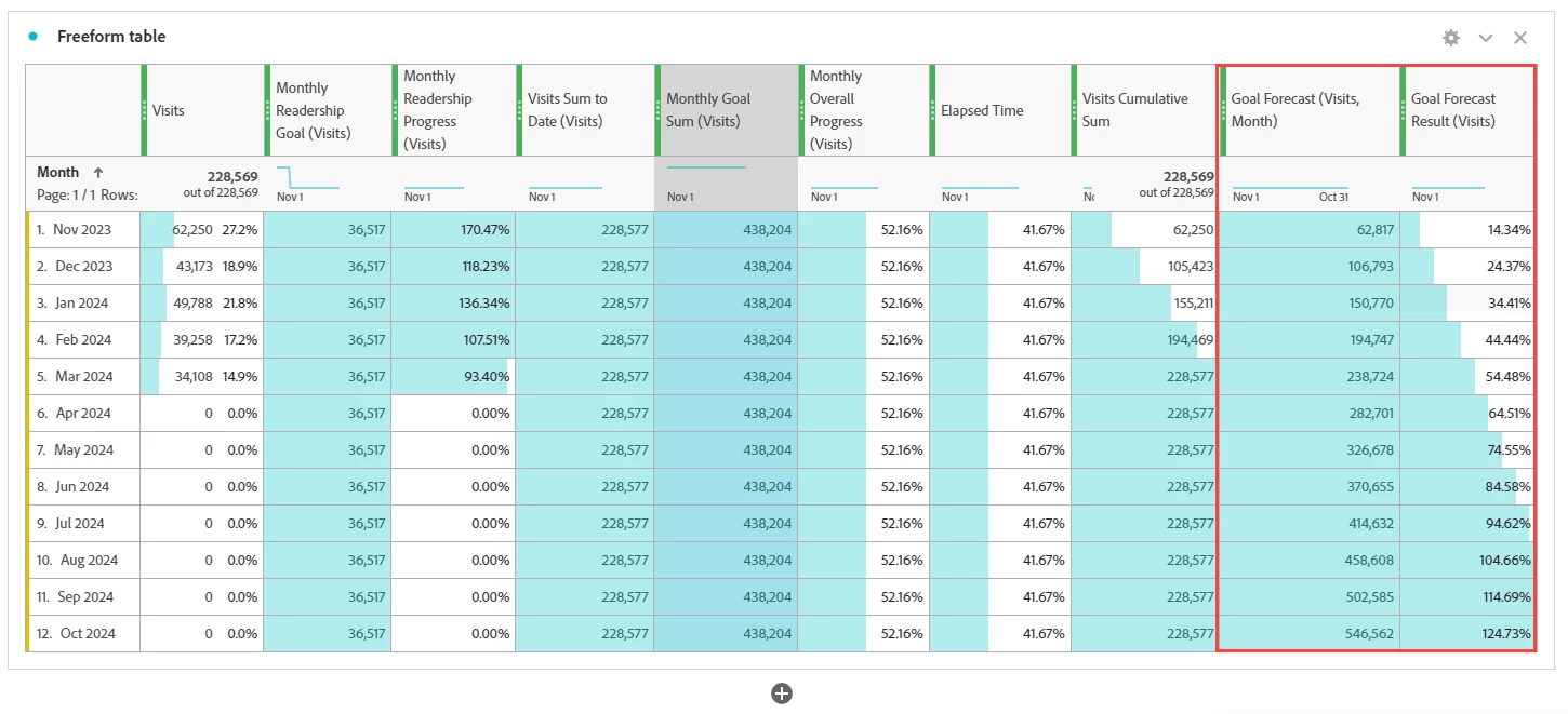 - Drag and drop the "Goal Forecast" metric to the table's tenth column.