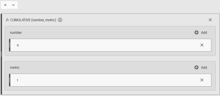 - Then search for the Cumulative function and drag it into the metric_x box within the Equal section. (The Cumulative function sets a row number to identify each month in the series.)