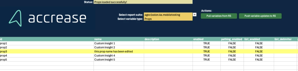 - Report Suite Editor: Select your report suites from the dropdown along with the variable type you wish to load. Click the pull button, and they will load. If you make any edits, the row will be highlighted in yellow - if you edit it back to its original value, it will still be highlighted. So, to 'reset' the sheet, you click the pull button again. Edits will populate the last column with a 'True.' Clicking the Push button will push all rows marked with True back into Adobe Analytics. After the push, you should click the Pull button to refresh and see your updates have been applied.