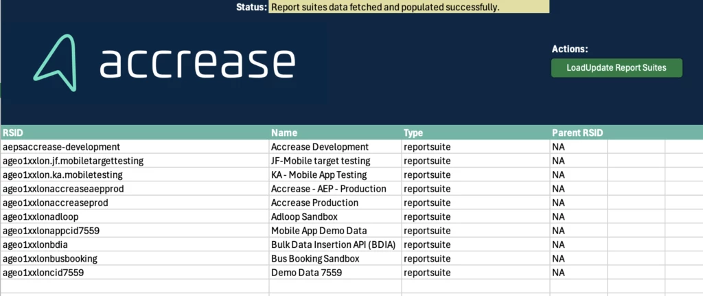 - Report Suite: Start here, as it functions as the source for the dropdown in the Report Suite Editor sheet. Other than that, it only has the purpose of giving you an overview of your report suites.
