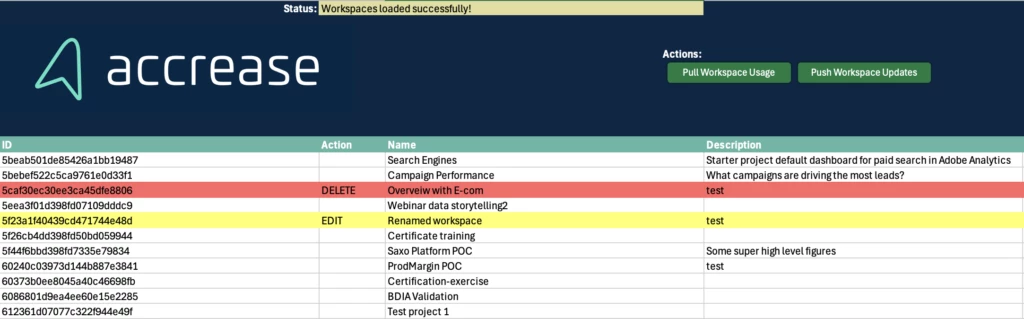 If you make any edits, the 'Action' column will have a value, and the rows will be highlighted in color. Based on this, the API will push updates for all workspaces with an EDIT or DELETE value set.