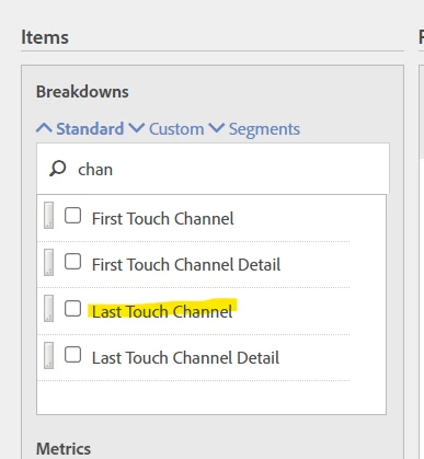 If you are looking at Adobe Data Warehouse, then you should look for Last Touch Channel and Last Touch Channel Detail (Marketing Channel and Last Touch Channel return the same results in Workspace)