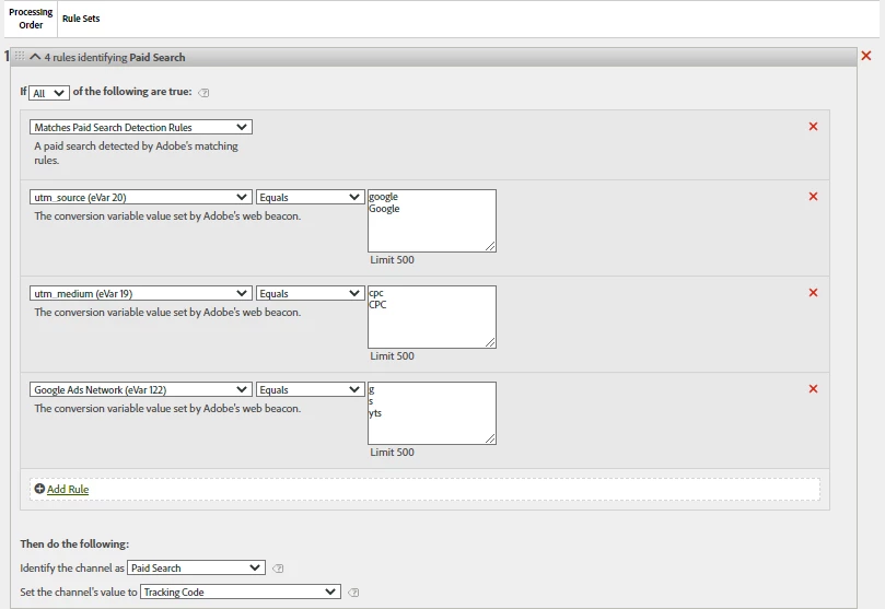 Please refer to the screenshots below for the exact Processing Rules for 'Paid Search' and also a screenshot of the Paid Search detection rules setup. We have 4 conditions which must all match in order for the traffic to flow into 'Paid Search'. All conditions have been precisely satisfied, yet it still fails to flow into the correct marketing channel. Anyone know why does this happen?