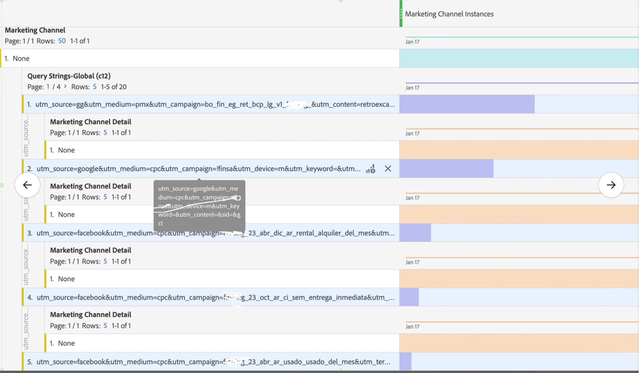 Within the Direct marketing channel, a few of our paid channels are recorded. Upon breaking down these channels by marketing channel detail, the landing page “pathname” is revealed. No further details available to debug further