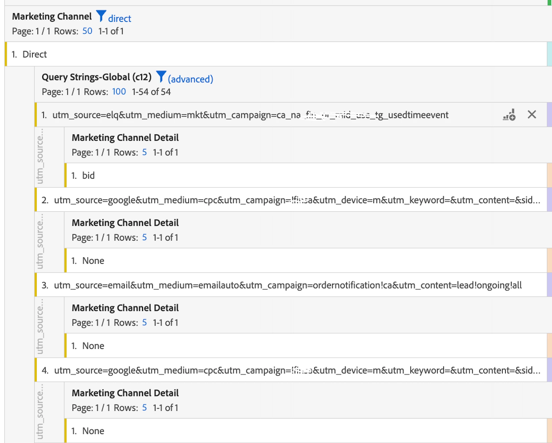Some campaign query string parameters are incorrectly categorized as “None” in the Marketing Channel Report instead of their actual marketing channel classification. When I analyze the breakdown of the Marketing Channel (“None”) report by Marketing Channel Detail, the result still shows “none,” and I am facing difficulty identifying the root cause.