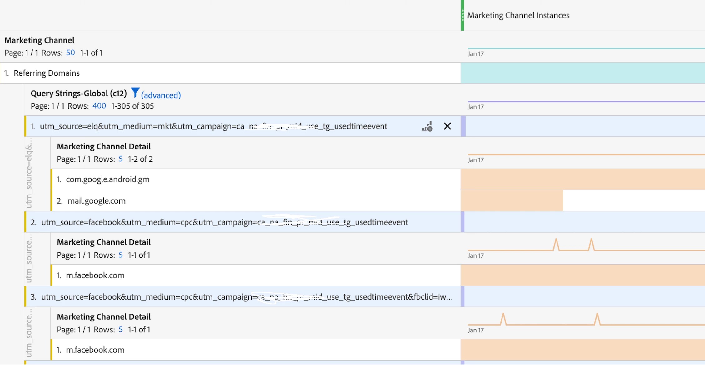 Certain paid campaign query parameters are mistakenly categorized under “Referring Domain” instead of “paid search” in the Marketing Channel Report. When I further break down these parameters by Marketing Channel Detail, it displays sources such as “m.facebook.com” and “l.facebook.com.”