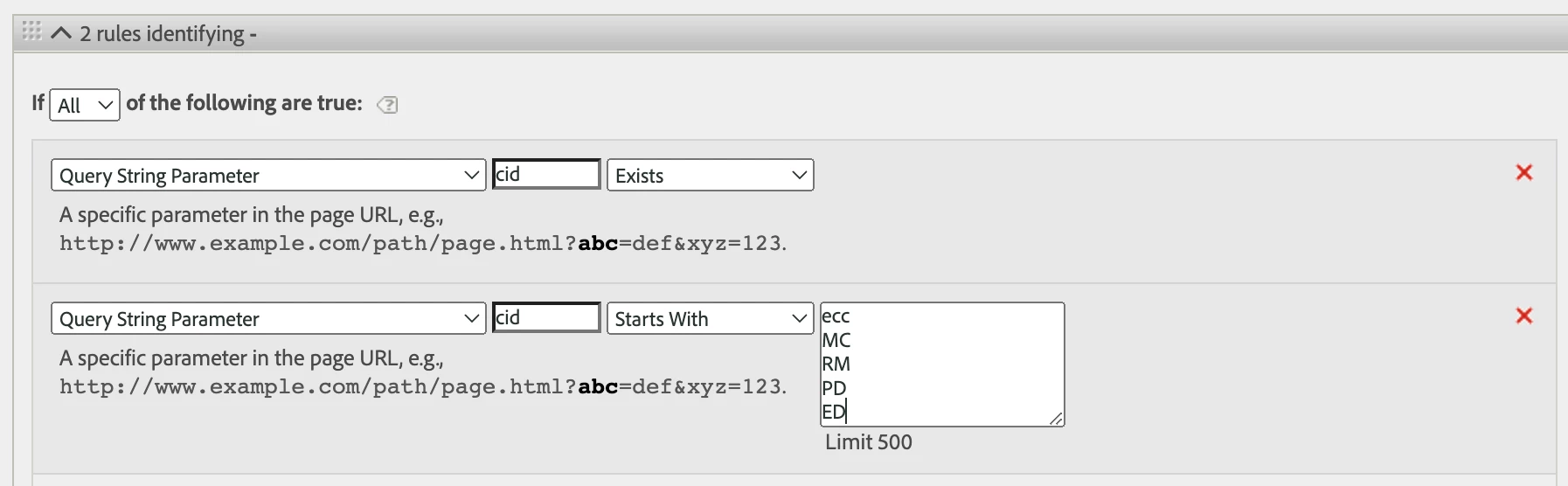 However, since Tracking Code is based on your cid qsp (but has 1retention), I don't see a need to check both here... just checking the actual qsp is enough; and this ensures you are only looking at the instances of qsp being set and not the 1 week (or custom retention) of your Tracking Code.