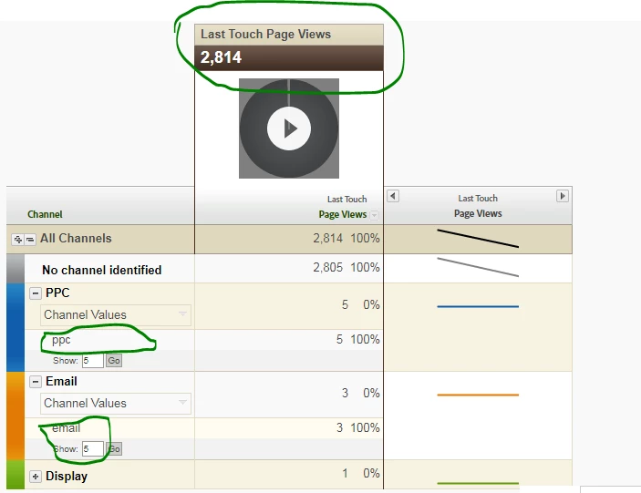 2) „last touch page views“ mean „how many pages have the user seen in total after they matched a specific marketing channel“