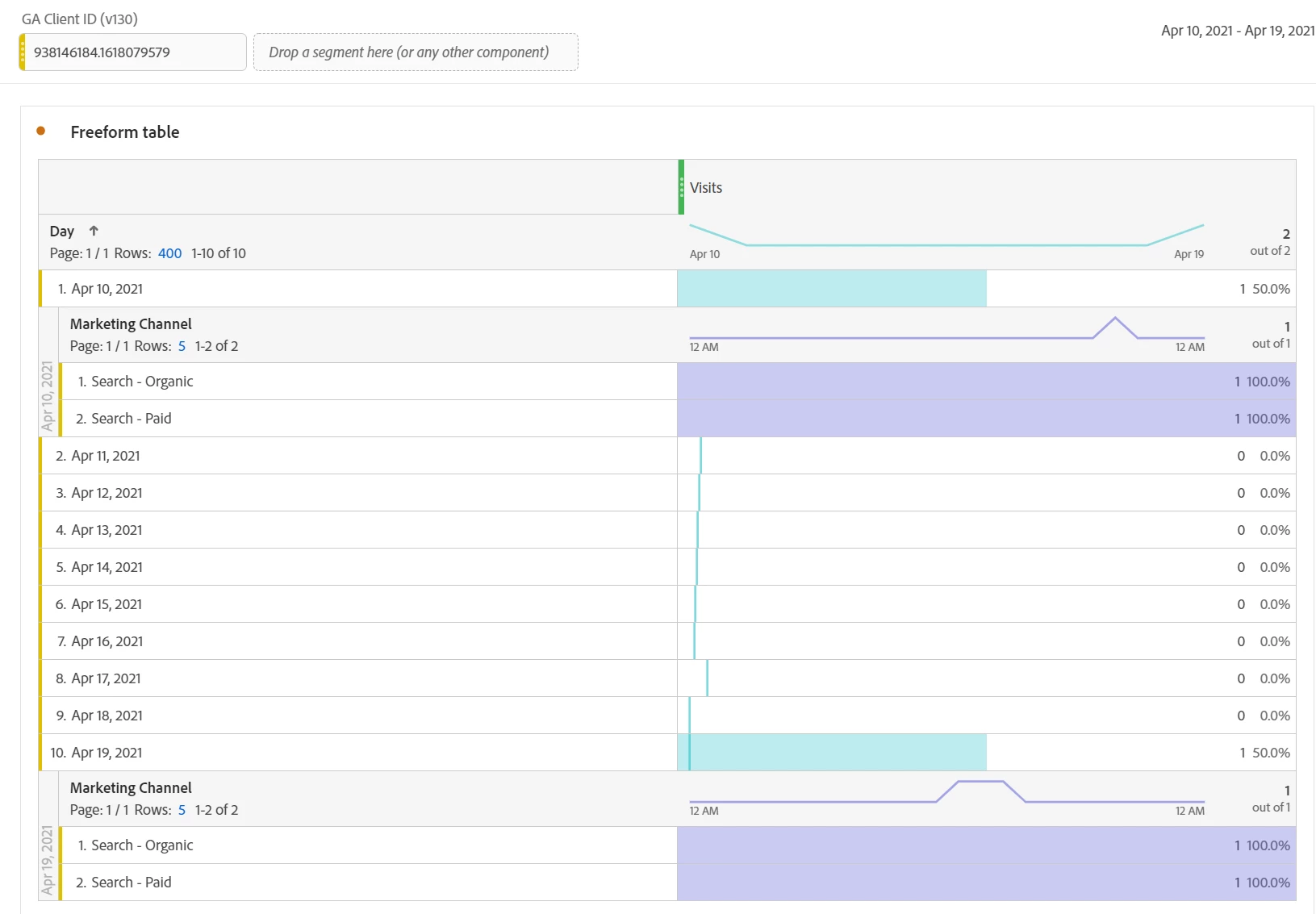 After isolating that single user, I looked at the channel they've been attributed to and they're attributed to both Paid and Organic Search