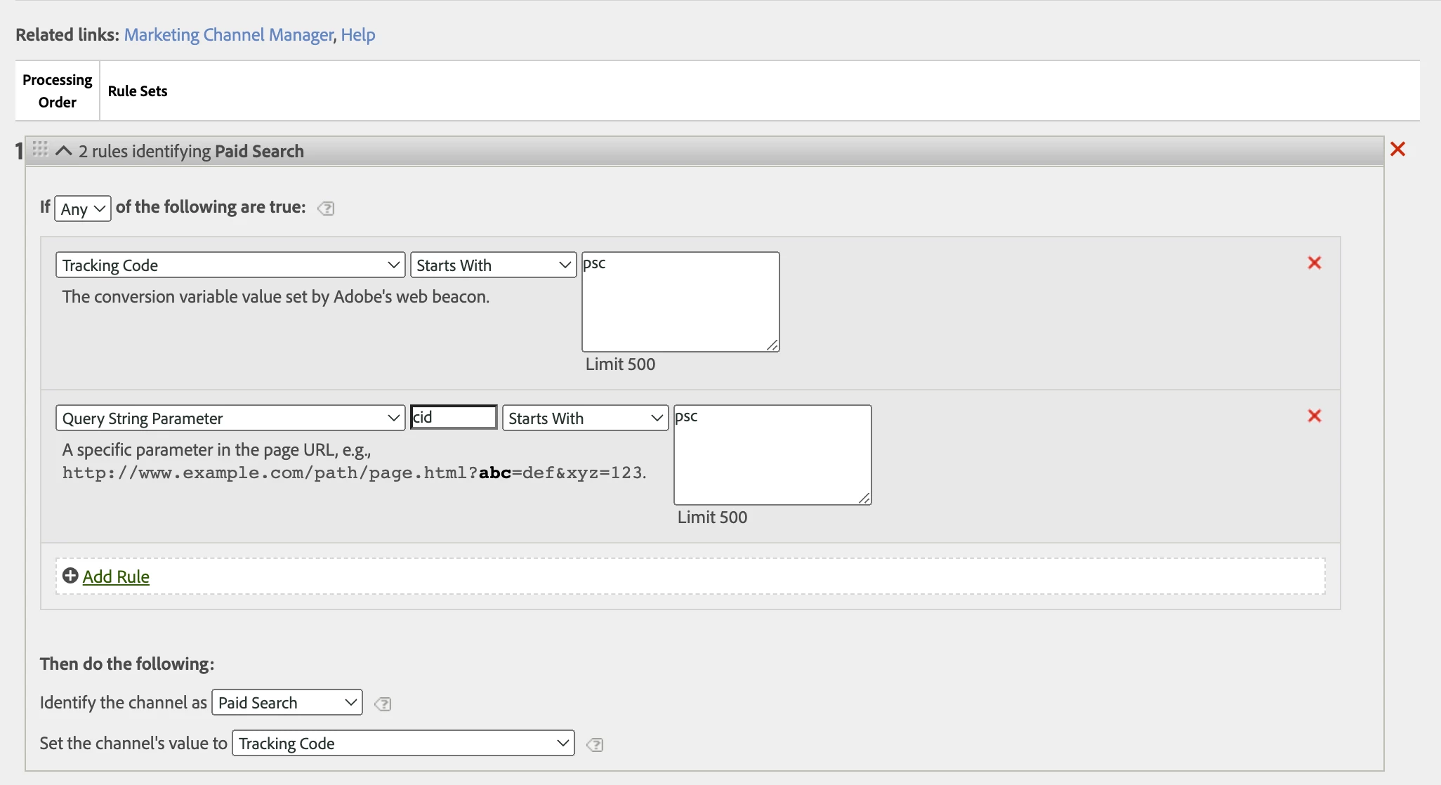 First, the marketing channel rules are evaluated top down with "first match wins". that means, as soon as a single hit has a match, all rules below are ignored (the channel is set by the first match). so make sure, that you start with the easiest channels to detect (eg. based on tracking code, then search engines) and the rest below.