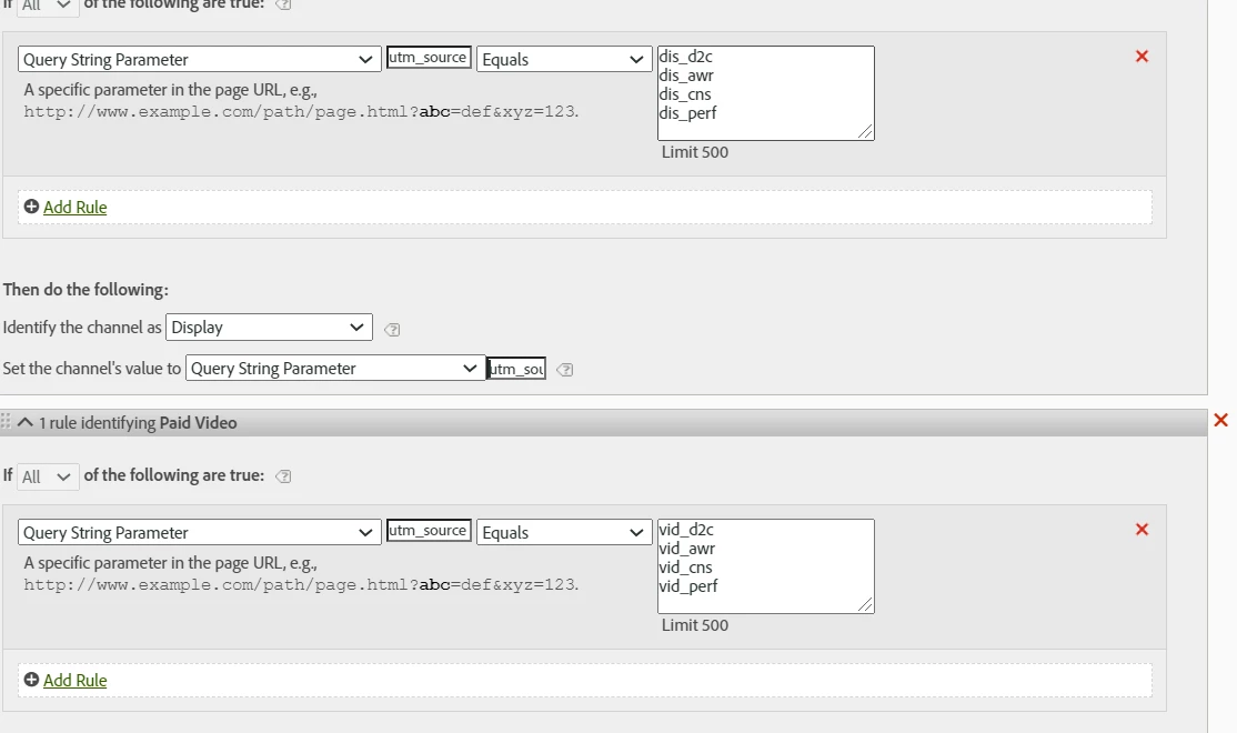 I am creating two marketing channel i.e. Paid video and Display. In both channels I am using utm_source parameter. But both utm_source have different values. Please find the reference image: