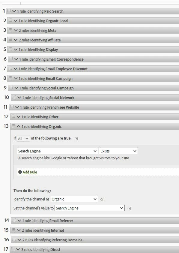 I am attempting to set up our Marketing Channel definitions and am not getting the Organic channel to populate. I was looking for 'campaign code is not set' AND search engine exists. This rule was prior to the rule to catch any remaining traffic with a referring domain into "referring domain'. From looking at our clickstream data it seems that the only traffic making into the Organic channel are those with the old-style referrers that include query string parameters like "https://www.google.com/search?q=what+are+mainstay+suites&ie=utf-8&oe=utf-8&client=firefox-b-1-m". Why would that be?