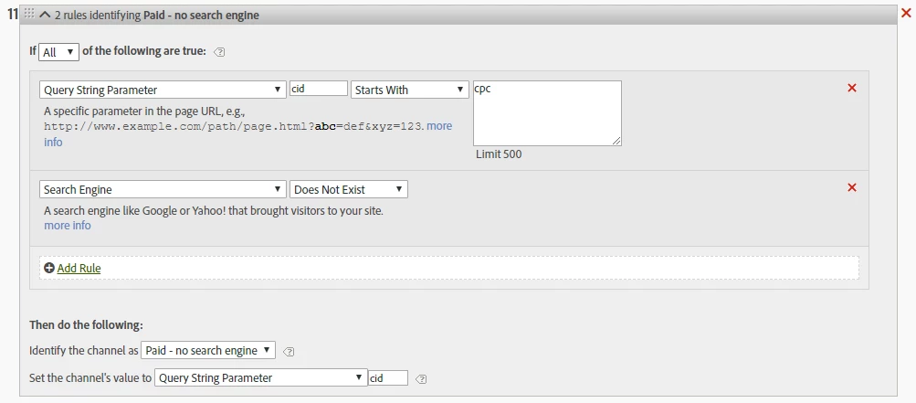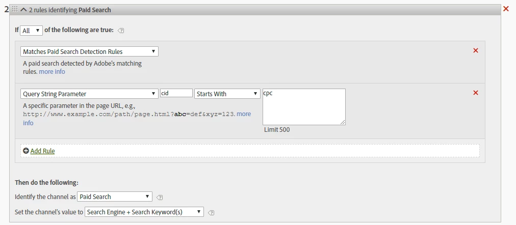 The query string parameters all begin with cid followed by the channel identification code. In case of paid search it is cid=cpc. (social is cid=social etc.) so I have set up the Paid Search detection rules like this (search engine "any" and query string contains cid=cpc and other containing just cpc - don't know what is the proper syntax, but I suppose these should both work):
