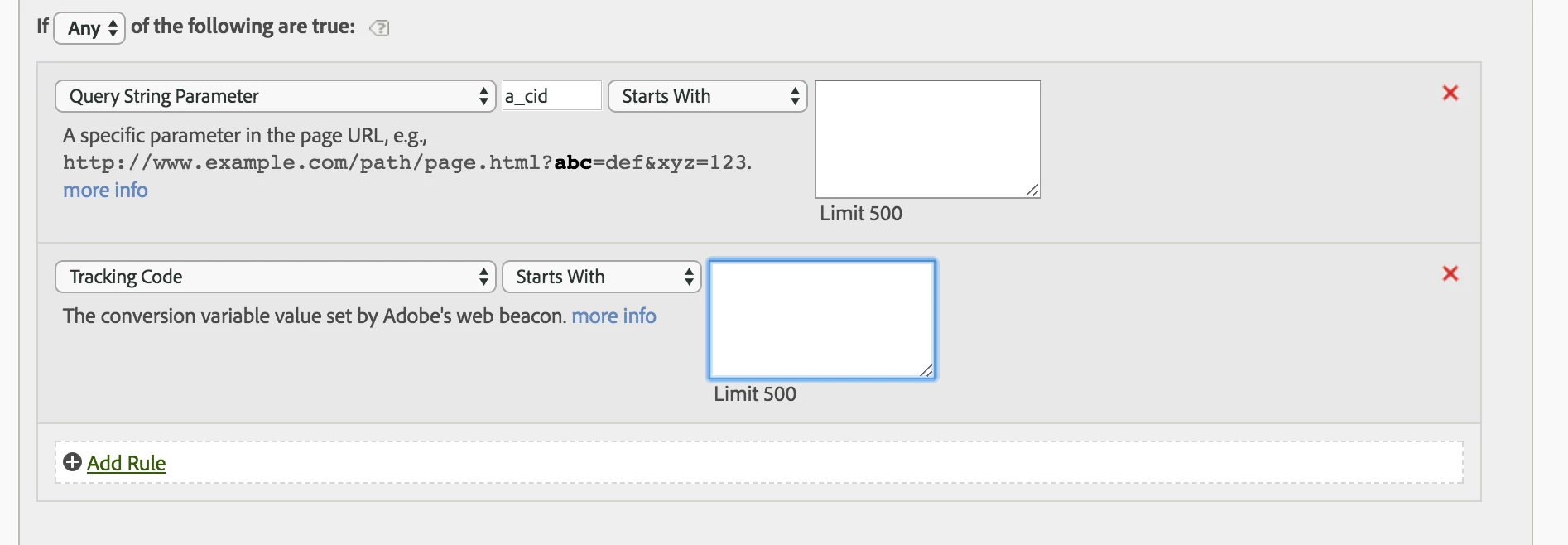 - If you are using getValOnce, or some other utility, that limits the passing of values from the query string to tracking code, then you may want to use tracking code so the same limitations are applied to marketing channels.