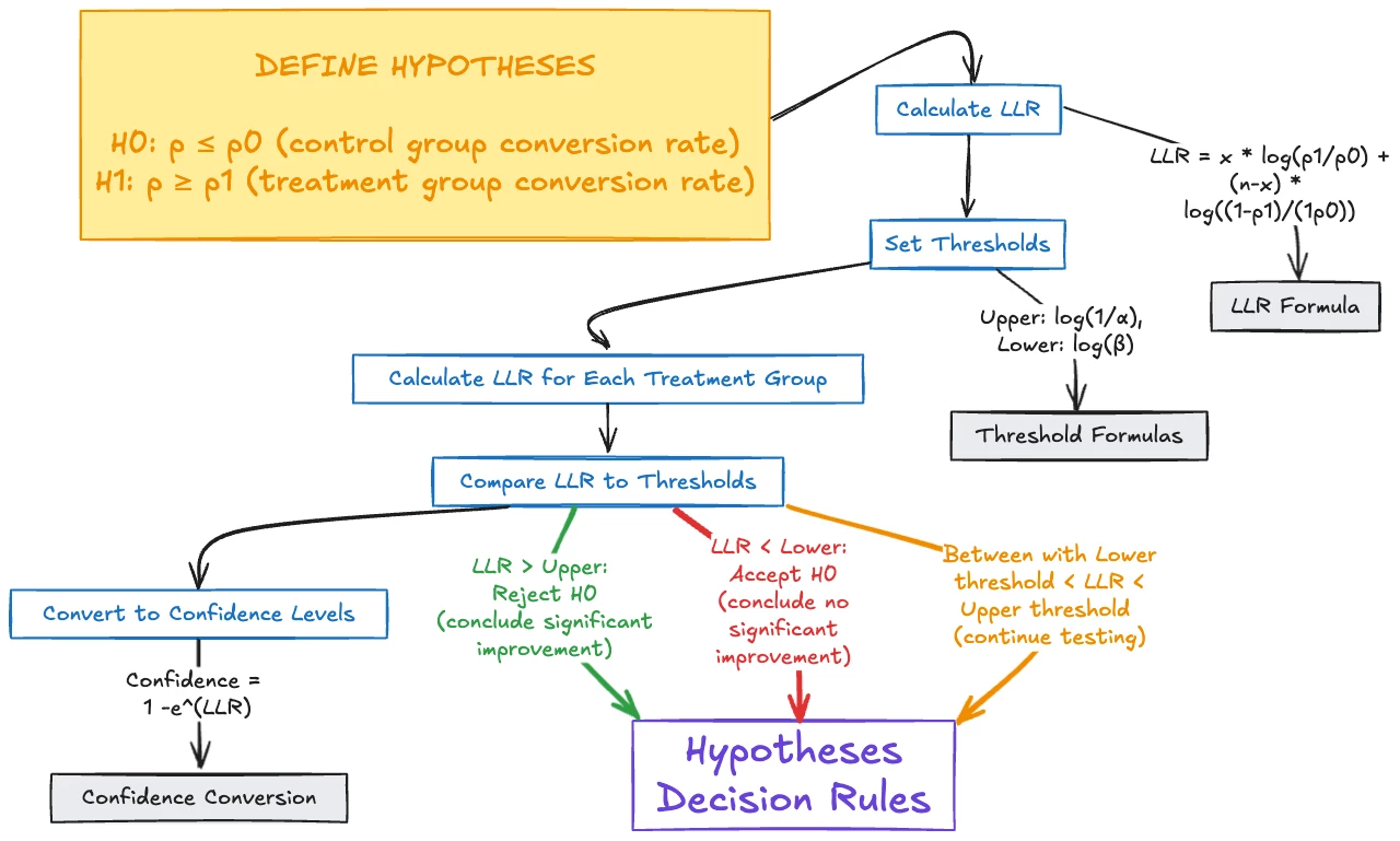 - Confidence Calculation: The confidence calculation uses a method called Sequential Probability Ratio Test (SPRT) to determine how sure we can be about the results. Think of it like this: as customers interact with different versions of your website or app, the system continuously collects data and updates its level of certainty about which version is performing better. The beauty of this approach is that it's like checking the score of a game while it's still being played - you can look at the results at any time, and the statistics remain valid. This is different from traditional testing methods where you have to wait until the end to draw conclusions. For example, if Version A shows strong positive results early on, you can be confident in those results without waiting for the entire test period to end. This flexibility allows businesses to make faster, data-informed decisions while maintaining statistical reliability.