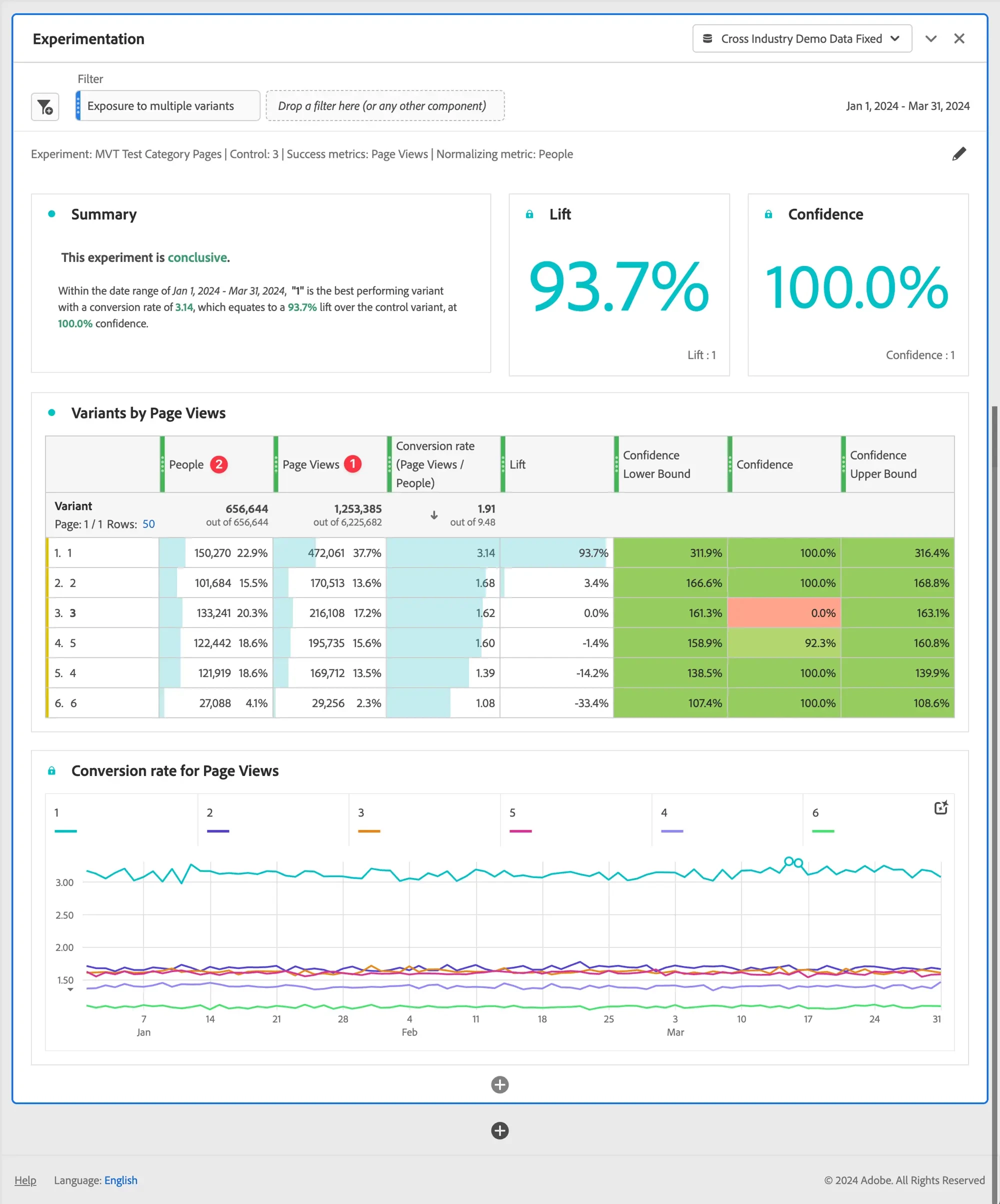 The CJA Experimentation Panel is a template that simplifies the analysis and interpretation of A/B tests and multivariate experiments. It provides a toolkit—from experiment and variant component context labeling in Data Views to built-in statistical methods—that helps organizations make confident, data-informed decisions about their experiments.