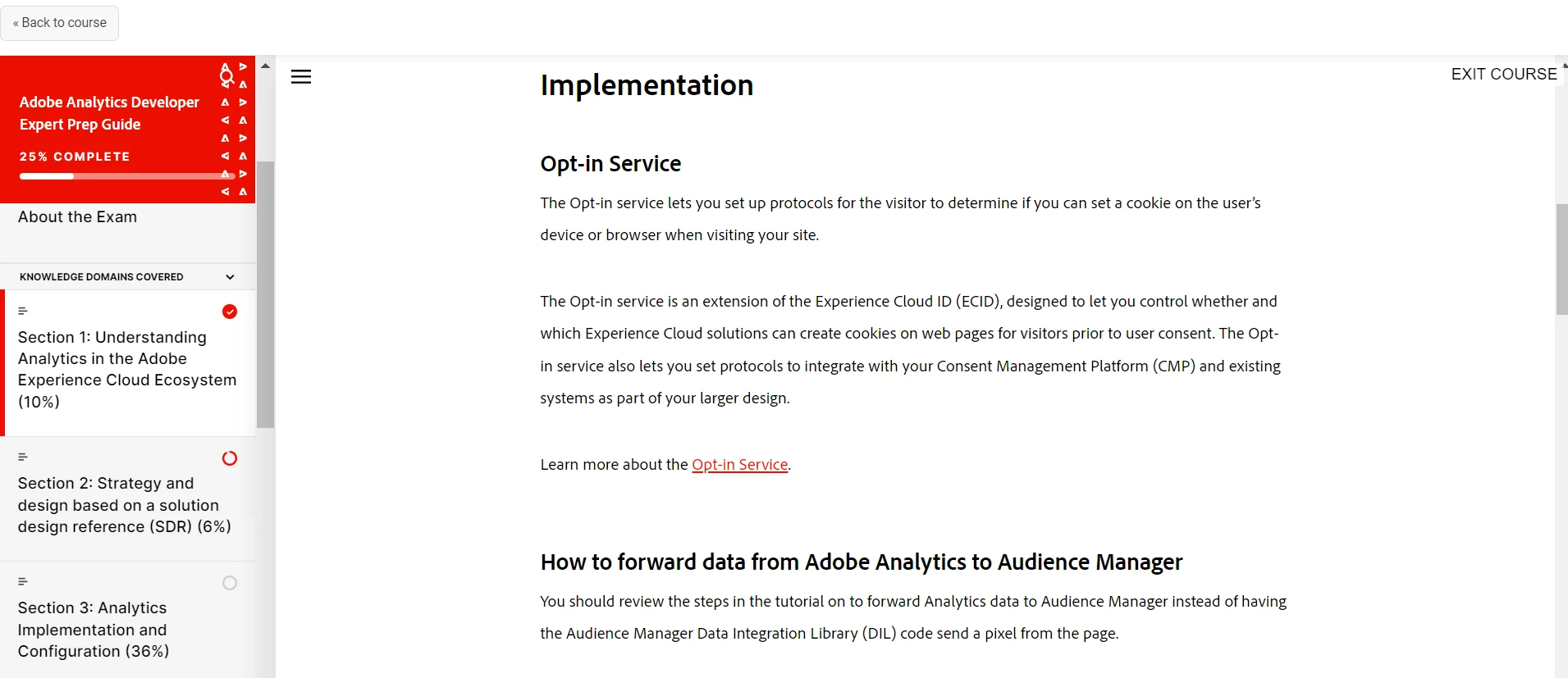 Also, here is the latest interactive exam guide link - Adobe Analytics Developer Expert Prep Guide which will be very useful in preparing for the certification. Each section has a short description as well as informative links associated with it. I'd absolutely recommend you all to go through this.