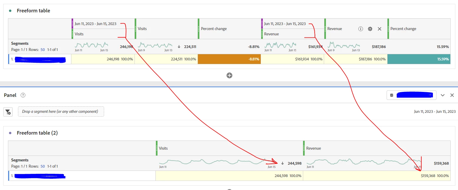 When I utilize the segment in a Freeform table within a Date Range comparison, I see a different number for Visits & Revenue than I see when creating a Freeform Table under a new panel with the 2023 dates as the panel date range. Can someone help me understand why this might be happening? Shouldn't the numbers be the same?