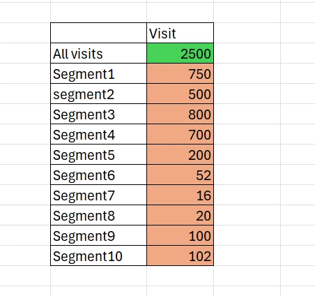 Example : ALL VISIT is a standard segment from Adobe. Segment 1 to segment 10 are different segments that have a count of certain visitors. when we sum up all these segments, it is greater that the all visit count.
