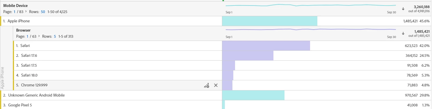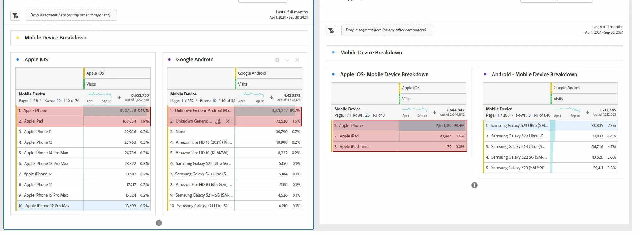Is there an alternative solution to the shortcomings of the Mobile Device report where most devices are grouped into generic categories for both iOS and Android? I understand there's a gap in how the User Agent provides this data to Adobe Analytics. Please see an example of the issue attached.