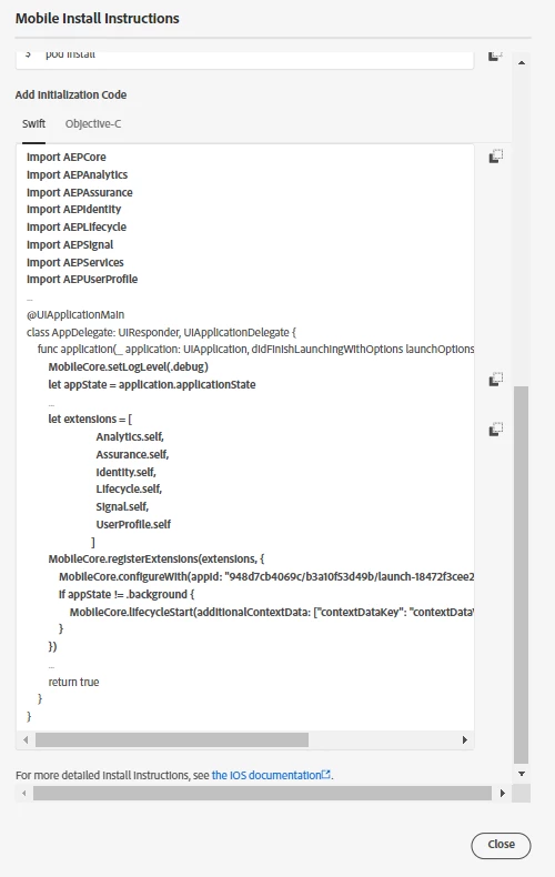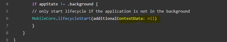 The only thing which we noticed is different on our code vs the instruction is that in the below line of code where "additionalContextData:" mentioned as "nil". On the launch instructions, it is mentioned as "MobileCore.lifecycleStart(additionalContextData: ["contextDataKey": "contextDataVal"])" .