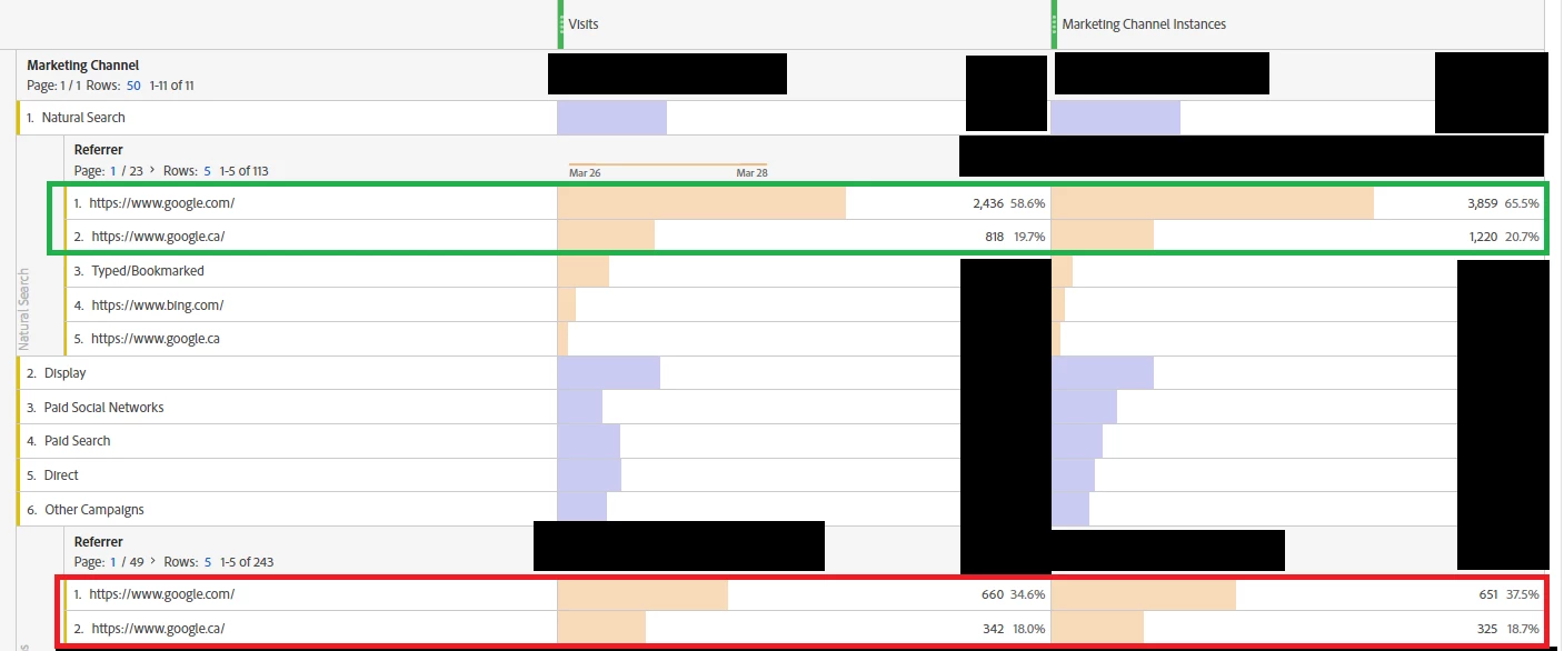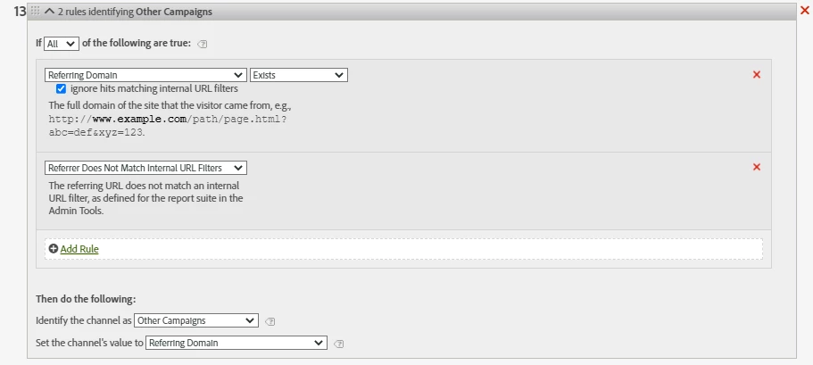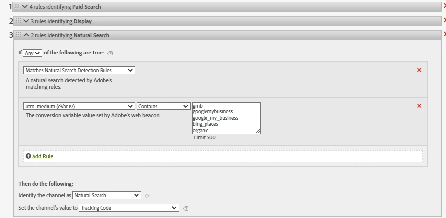 I've been noticing that some of my visits/marketing channel instances are being assigned to 'Other Campaigns'. However there is a referrer assigned 'Google' within the 'Other campaigns' channel. When reviewing my marketing channel rules, if a user does not fulfill the paid search criteria, but clearly has a referrer from a search engine the 'Natural Search Detection Rules' should pick that up as natural search. So far the only reference material I have been able to find on 'Natural Search Detection Rules' is here: https://experienceleague.adobe.com/docs/analytics/components/marketing-channels/c-rules.html?lang=en#natural-search Could someone provide more insight into 'Natural Search Detection Rules' and the conditions surrounding this?