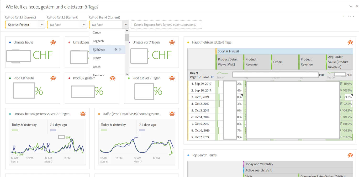 So the "Sport & Freizeit" filter on top would mean that it works as if it was actually on top of the table of each of the tables in the screenshot, just like in the example of the "Hauptmetriken..." table on the right.