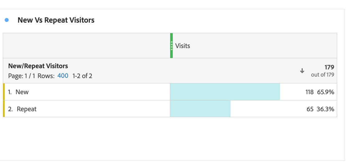 If you can check the screenshot the sum of New and repeat Visitors count doesn't match with Visits data. New and repeat - 118+65=183, in Visits data it is showing 179. 183 is not matching the 179 data in visits.