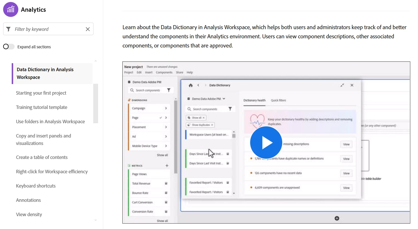 Every topic here has the dedicated video like below video tutorial for Data Dictionary in Analysis Workspace,