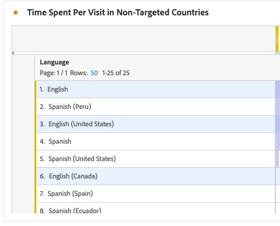 Maybe this is a dumb question, but I CANNOT figure it out. I'm filtering visits by language, and the languages are listed by country (i.e. Spanish (Argentina), Spanish (Peru), etc.). There is a plain "Spanish," but I can't tell if it is a combination of all the other Spanish(es) broken down by country or if it's just like that because those people didn't specify on their browser that they're in a certain Spanish-speaking country. My question: is there a dimension that's just all the Spanish languages combined so I can create a graph with one Spanish line (representing all the different Spanish(es)? It's not relevant what country that particular Spanish speaker is from. The same question applies to English, Portuguese, and all the other languages.