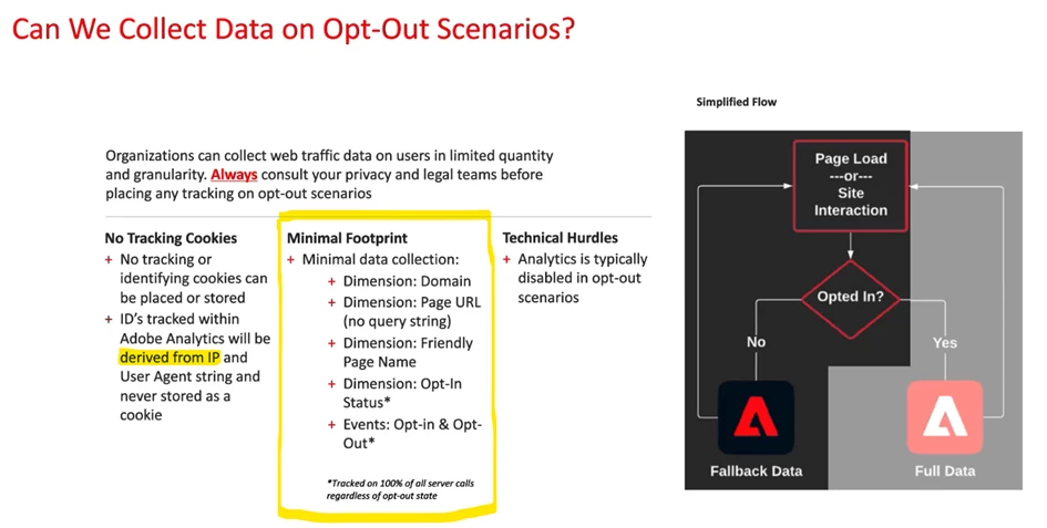 I am currently exploring options to be able to track basic traffic data on our web and in mobile app in opt-out scenario. In our current situation, Adobe Analytics tracking is strictly bound to opt-in scenario, meaning if the customer declines analytics cookies, Adobe Analytics in not fired at all.